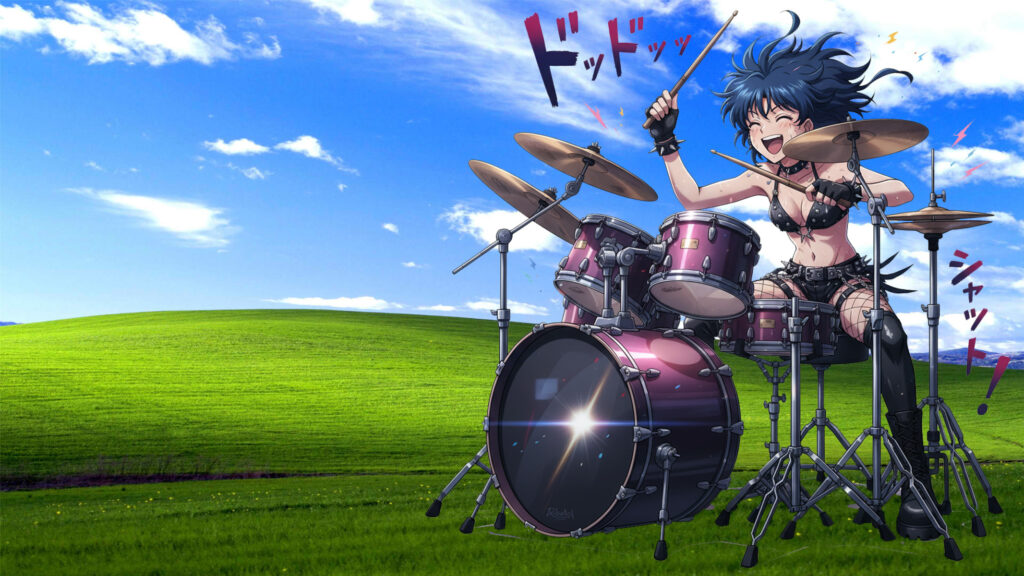 Also hat Ami ein Schlagzeug in die Grüne Idylle geschleppt, sich das entsprechende Outfit verpasst und dann geht’s los bis die Kessel und Becken glühen.