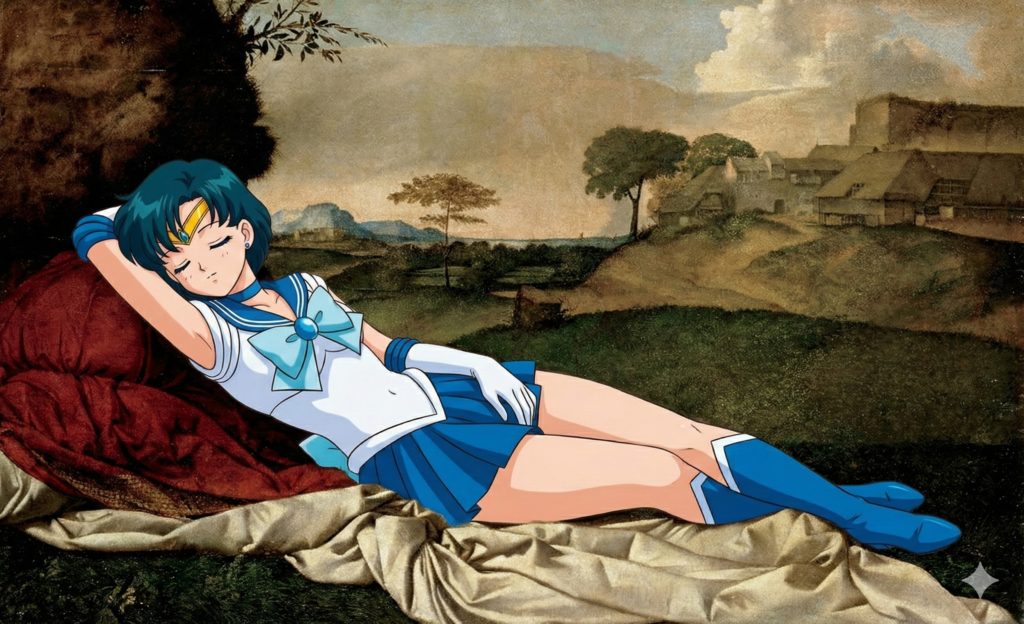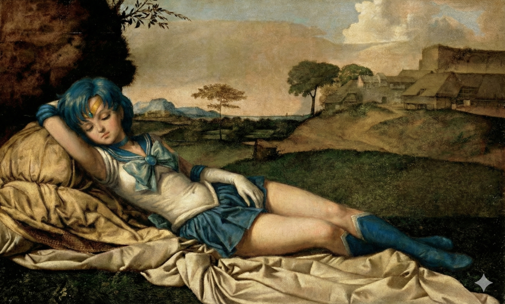 Noch ein wenig mit Nano Banana herumgespielt. Nun ist Ami deutlich besser im Stil eingebunden: „Schlafende Merkur“ von Nano Banana (2025) basierend auf Giorgiones „Schlafende Venus“ (1510):