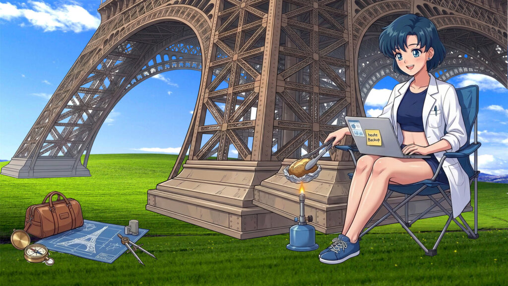 Also macht es sich Ami am Eiffelturm bequem, startet ein Backup und erwärmt am Bunsenbrenner eine Backkartoffel.